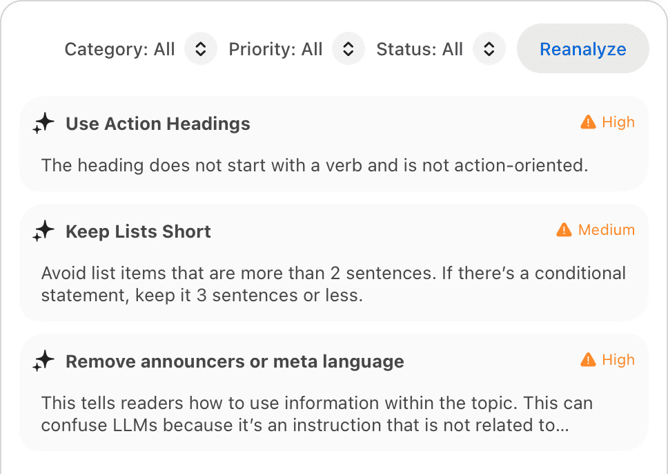 Clear, actionable AI suggestions that improve content quality by aligning with the writing style guide.